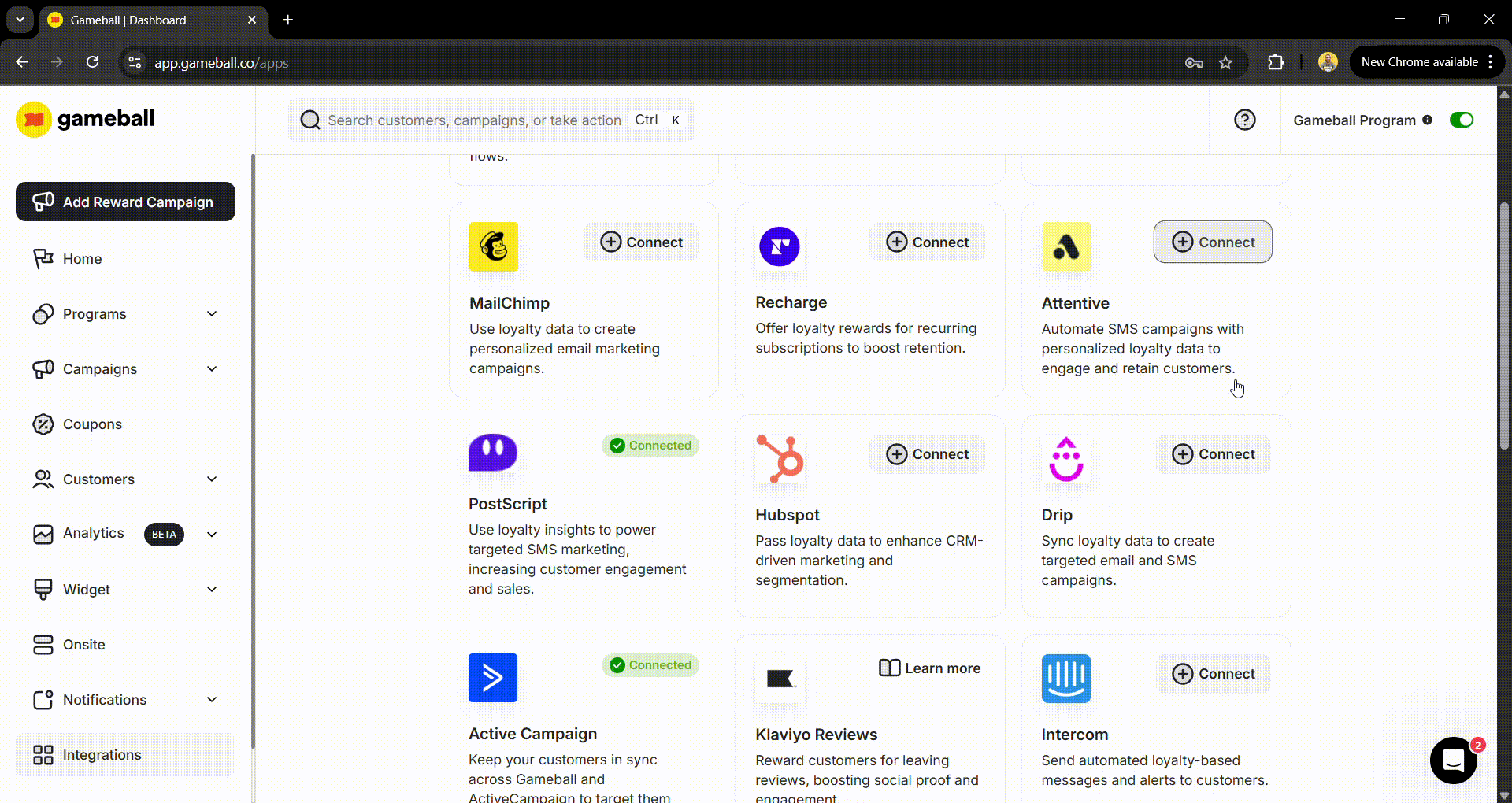 - Go back to the integration section on the dashboard to ensure that the Attentive app is now connected to your Gameball account.
