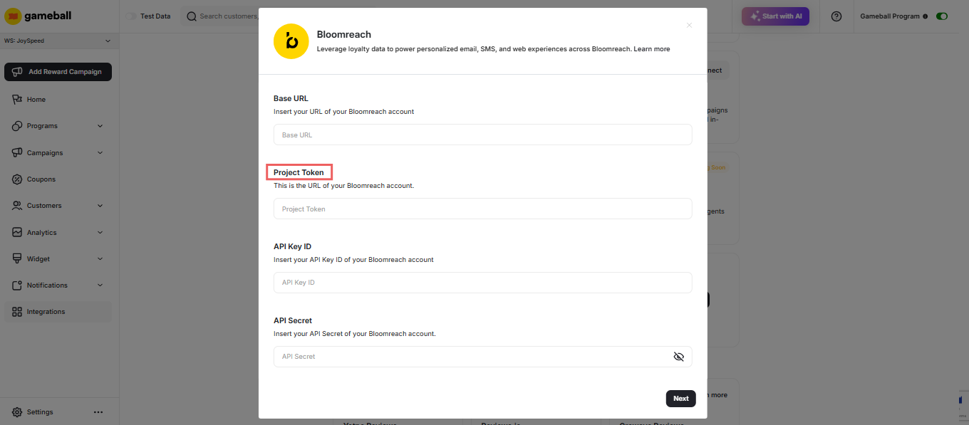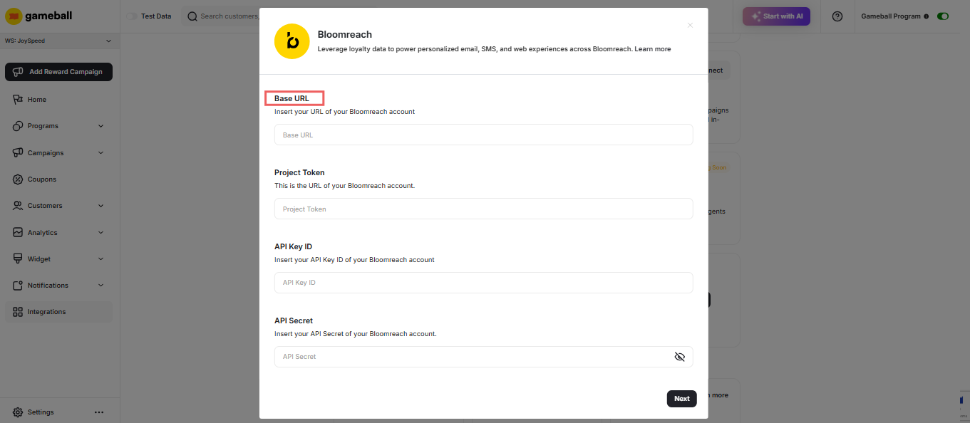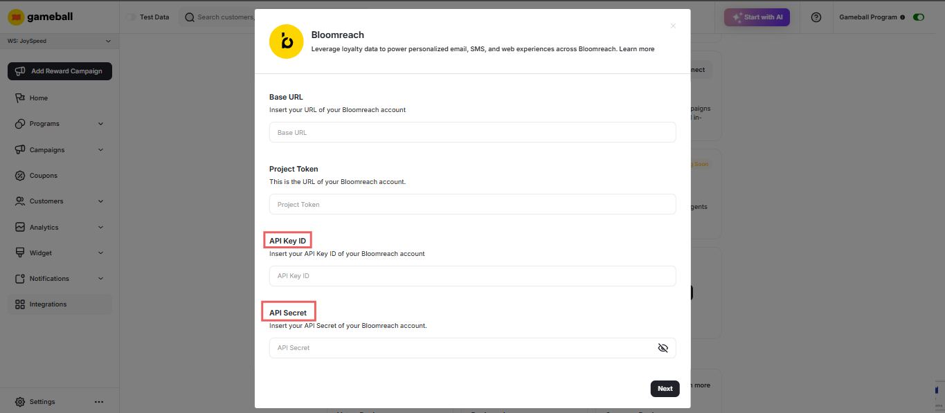 - In the Gameball Dashboard, navigate to Integrations > Bloomreach.