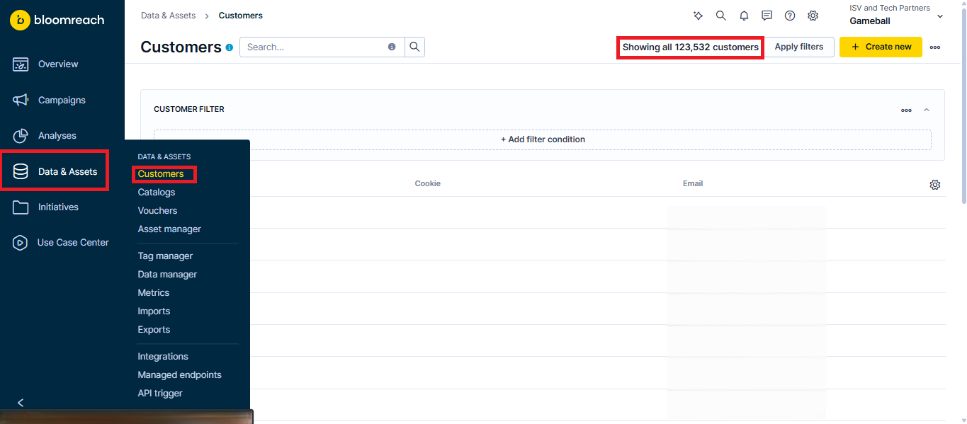 In Bloomreach, go to Data and Assets > Customers to find a table with all automatically synced Gameball customers.