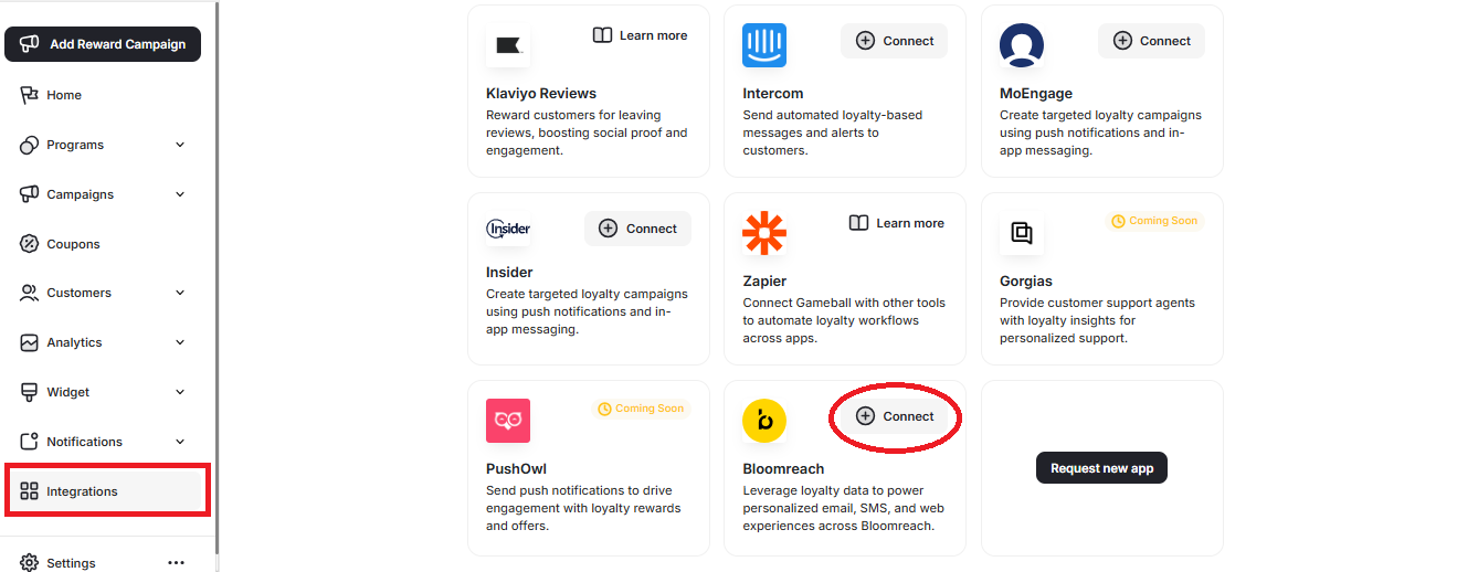Navigate to Integrations in your Gameball Admin Dashboard menu. Scroll down to Bloomreach and click Connect.