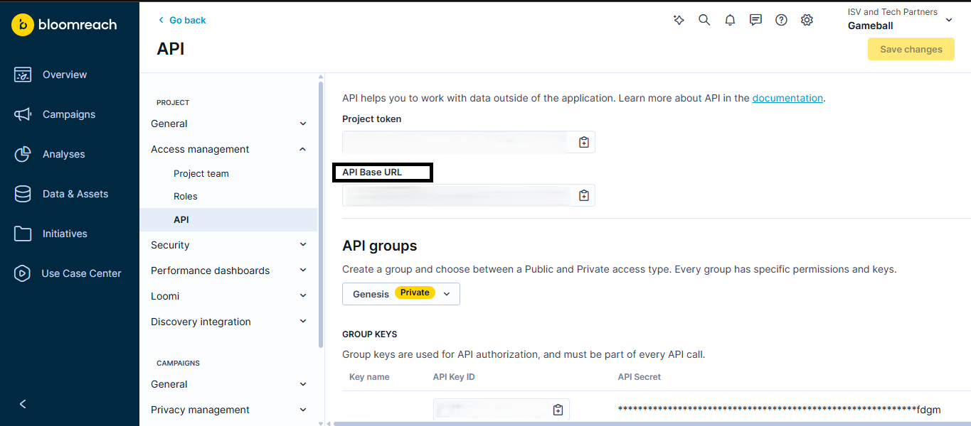 - In your Bloomreach account, go to Settings > Project Settings > Access Management > API.