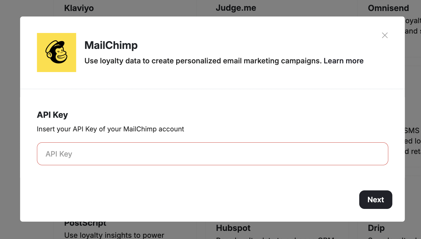 - Get your API Key from your MailChimp account through Settings > Integrations