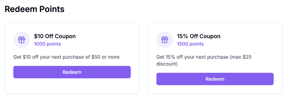 | Redemption flow is fully handled: point display, coupon generation, and coupon listing. | You handle reward options, redemption calls, and coupon display manually. |